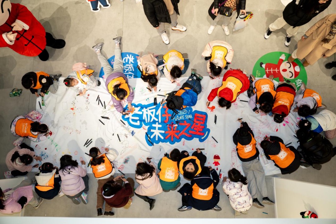 创作的产品不仅会参与线上画展,在big day现场,也精心布置画展,展出系列作品,并邀请所在地的学生一同打卡老板仔ip巨型画作涂鸦,对于老板仔而言,这不仅是一次与学生群体联手交心的活动,更是传递着对童心、想象力、探索欲与表达欲的呵护,将老板仔ip与城市打卡地相结合,述说着不一样的品牌故事。