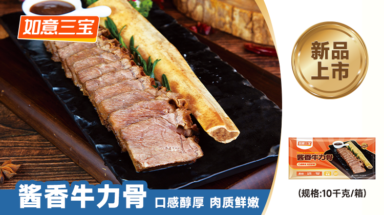 2024年3月,专业从事速冻肉类食品研发、生产和营销的如意三宝品牌,发布了6款新品,大厨特调卤水配方的酱香系列三款产品,酱香牛腱、酱香牛力骨、酱香牛肉,品牌王牌单品延展的蒜香扇子骨、黑椒牛仔骨,以及大众认知度非常高的凉菜产品凉拌牛肚丝。