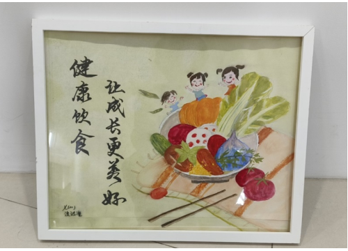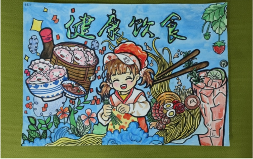 7年级的汐汐也获得了“小小食安员”的荣誉,AIGC的助力让她感受到了科技的魅力。在食安营养科普角和科普手册里,汐汐学习到了很多食安营养知识,对于“健康饮食”她特别感兴趣,课后认真研读并开始构思起了绘画内容, “把提示文字录入就出现了家人围坐用餐的画面,我觉得饭桌上的面条形状正好适合我的画面结构,就补充到了我的绘画中。” AIGC辅助绘画不仅让汐汐收获了创作新技能,也让食安营养知识更加入脑入心。