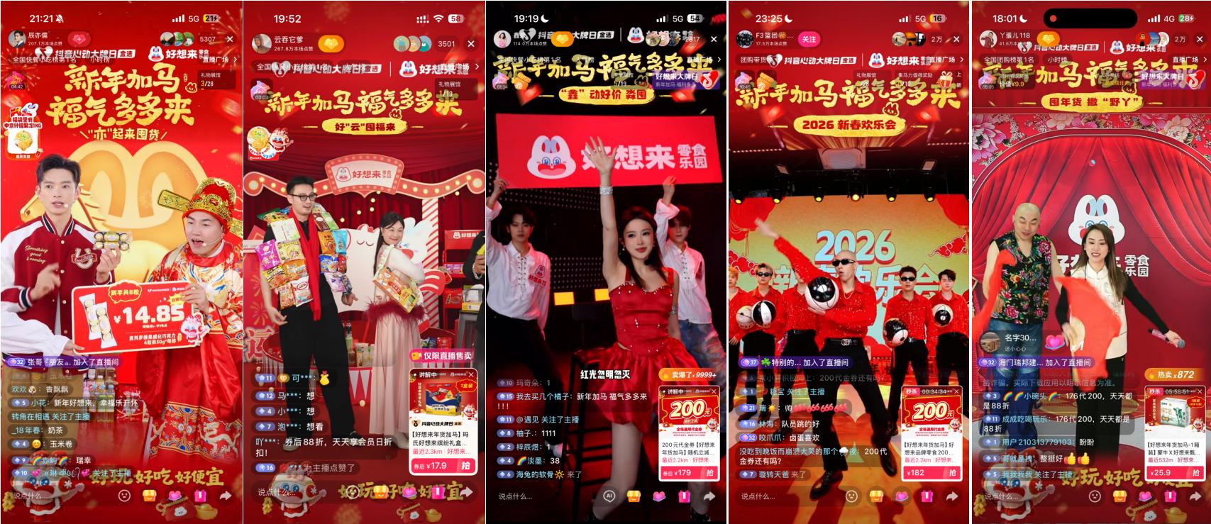 有了好价格,还要有好体验。好想来这次把直播间彻底“玩”出了新花样,不再是简单的讲解和上链接,而是打造成一个充满年味的“春晚式”综艺现场。品牌构建了“明星代言人空降主官号”“多场景主题官播”“超头达人分会场”的直播矩阵,实现声量聚合与高效转化,驱动成交集中爆发,创下最高单场直播场观突破22万+的亮眼成绩。