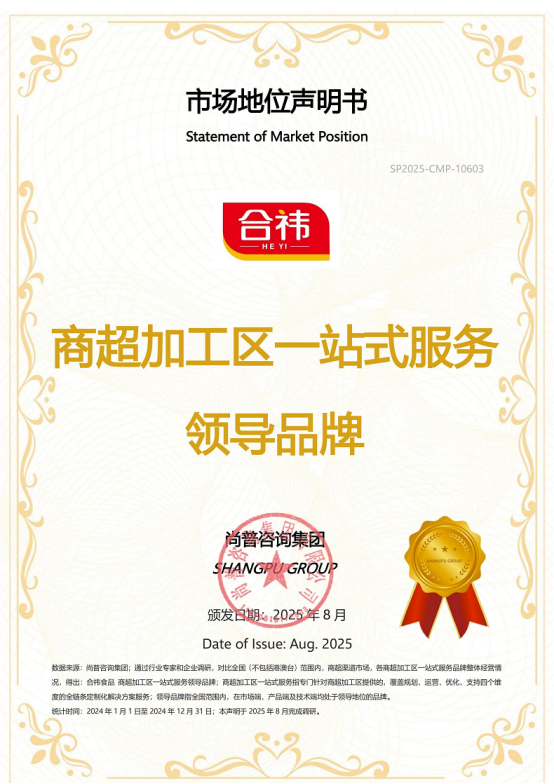 2025年8月,尚普咨询集团向合祎食品颁发市场地位声明书。合祎食品荣获【商超加工区一站式服务领导品牌】、【商超加工区一站式服务客户服务量第一品牌】、【商超加工区专业方案服务开创者(52周动态定制化服务)】三项市场地位声明,标志着其在速冻面米制品行业的标杆地位及市场的高度认可。
