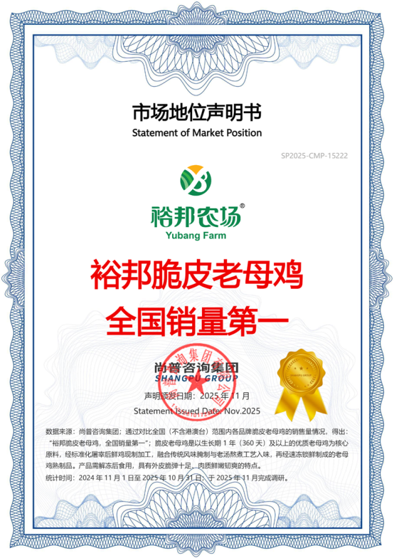 2025年11月,尚普咨询集团向山东裕邦食品集团有限公司旗下品牌“裕邦农场”颁发【裕邦脆皮老母鸡,全国销量第一】的市场地位声明书。此次“裕邦农场”荣获尚普咨询集团颁发的市场地位声明书,不仅是对其脆皮老母鸡熟食产品市场表现的高度认可,更是对其全产业链布局、标准化生产及食品安全体系的权威背书。“裕邦农场”品牌能够取得如此佳绩,其背后是严选原料、工艺革新、全链把控等多重优势的加持。